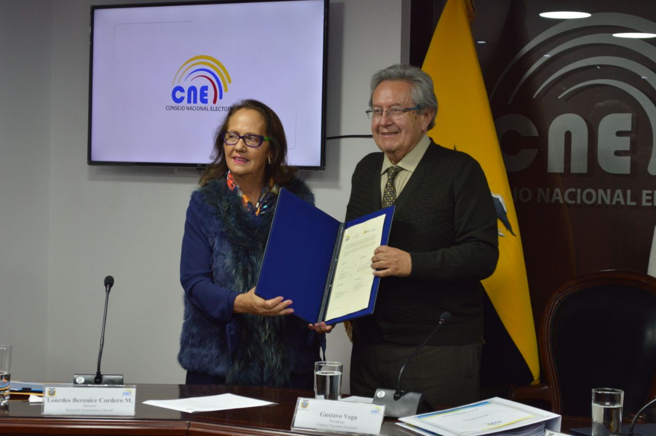 Por su parte, el presidente del CNE Transitorio, Gustavo Vega, manifestó que lo más importante es que la ciudadanía haga un seguimiento a este compromiso. «Festejamos celebrar este convenio de largo alcance para que los derechos de la ciudadanía sean respetados de cara a la democracia, buscando la igualdad y la inclusión» recalcó.