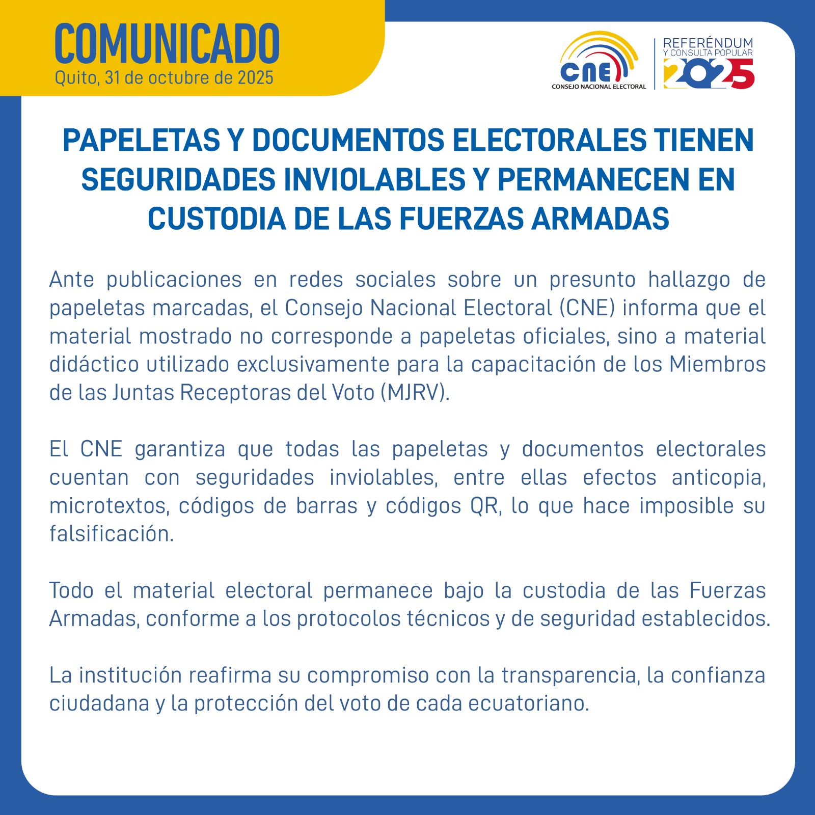 Ante publicaciones en redes sociales sobre un presunto hallazgo de papeletas marcadas, el Consejo Nacional Electoral (CNE) informa que el material mostrado no corresponde a papeletas oficiales, sino a material didáctico utilizado exclusivamente para la capacitación de los Miembros de las Juntas Receptoras del Voto (MJRV).
