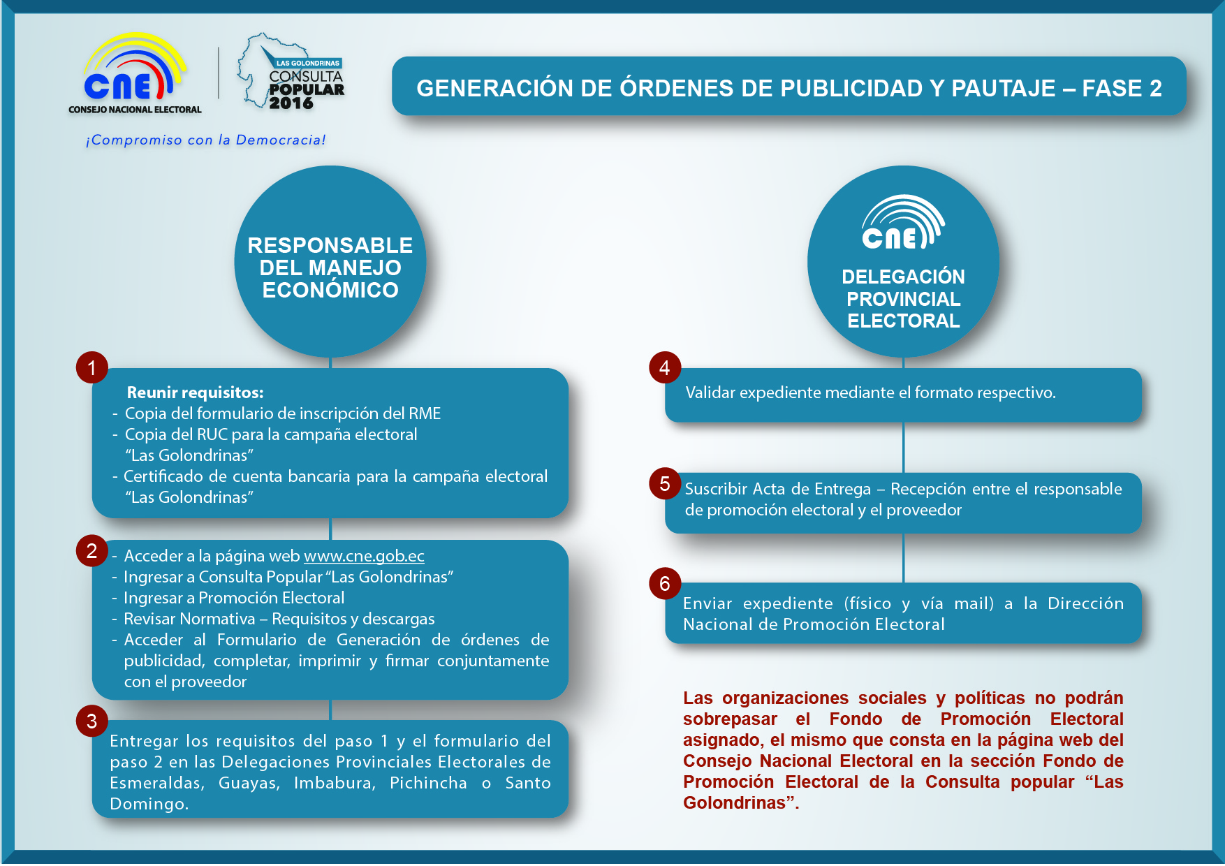 El Consejo Nacional Electoral (CNE) convoca a los medios de comunicación en general (prensa escrita, radio, televisión y empresas de vallas publicitarias) públicos, privados y comunitarios con cobertura nacional, regional y local, a registrarse y calificarse como proveedores de promoción electoral para la Consulta Popular del sector denominado Las Golondrinas, del 24 al 26 de febrero de 2016, en las oficinas de las Delegaciones Provinciales Electorales de Esmeraldas, Guayas, Imbabura, Pichincha y Santo Domingo de los Tsáchilas.