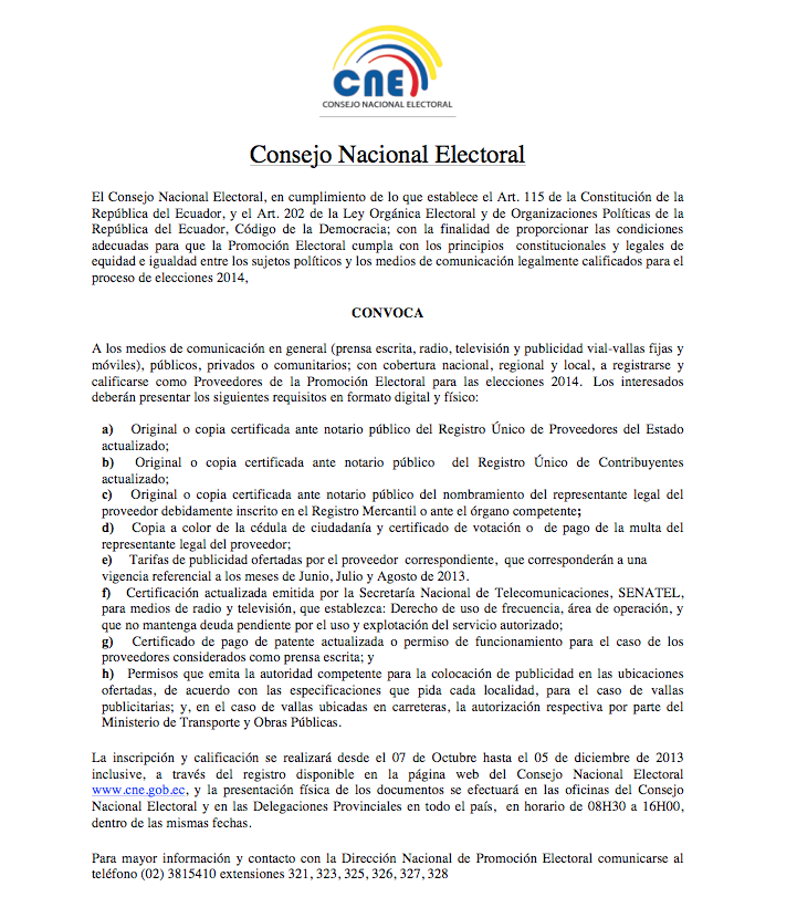 El Consejo Nacional Electoral, en cumplimiento de lo que establece el Art. 115 de la Constitución de la República del Ecuador, y el Art. 202 de la Ley Orgánica Electoral y de las Organizaciones Políticas de la República del Ecuador, Código de la Democracia; con la finalidad de proporcionar las condiciones adecuadas para que la Promoción Electoral cumpla con los principios constitucionales y legales de equidad e igualdad entre los sujetos políticos y los medios de comunicación legalmente calificados para el proceso de elecciones 2014.
